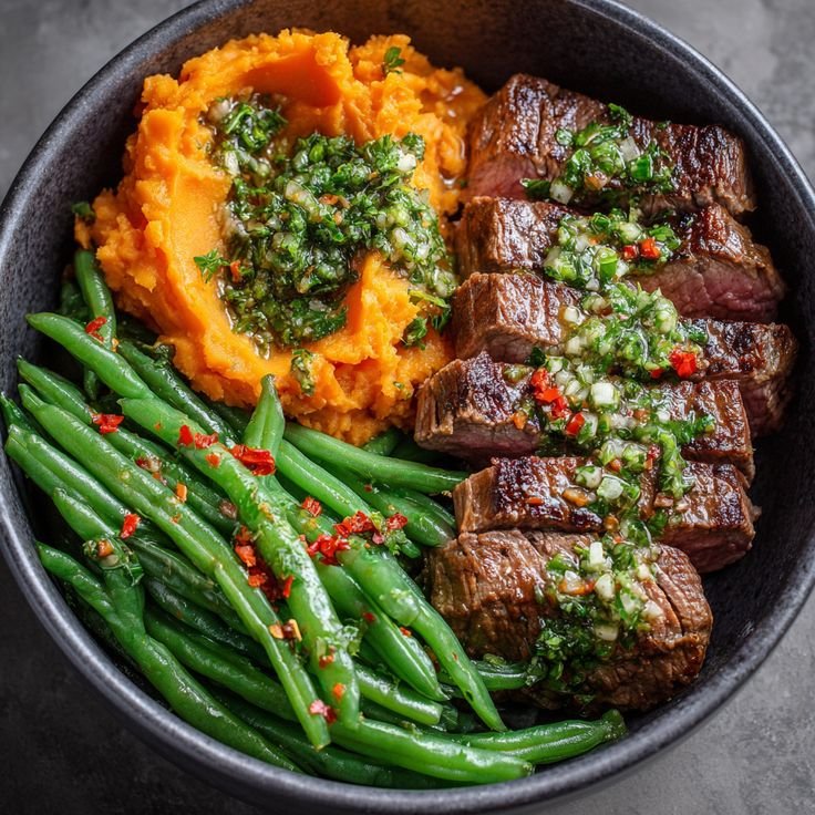 Bowl de Bife de Chorizo, Boniato y Chauchas